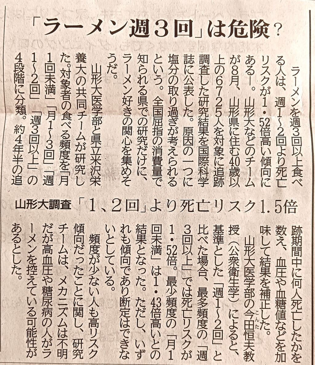 ラーメンを週に3回以上食べる人は、週1~2回より死亡率が1.52倍高い。1.52倍という数字をどうとらえるかはともかく、高くなるのはわかる気がする。