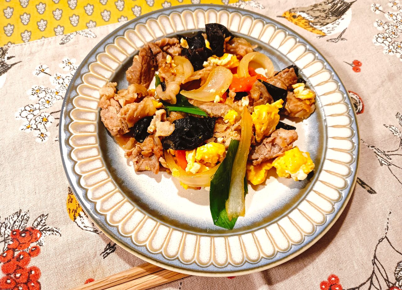 豚肉とキクラゲの中華風炒めを作った(他に卵、自家栽培パプリカ、タマネギ、長ねぎ入り)。